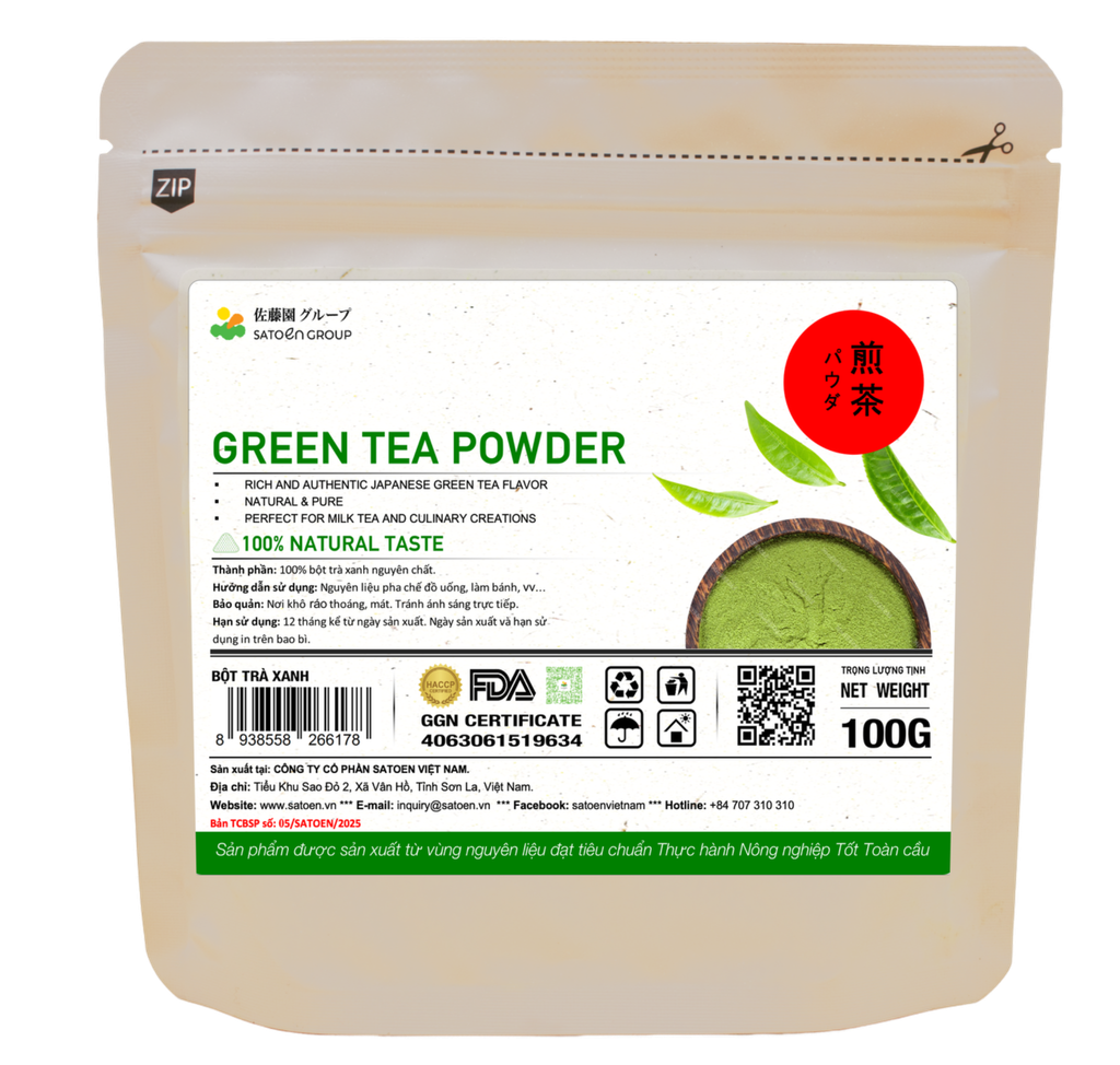 Được chế biến từ lá trà xanh Sencha vụ Hè–Thu, bột trà mang hương thơm tự nhiên, vị chát nhẹ và hậu vị thanh mát đặc trưng của trà Nhật truyền thống.